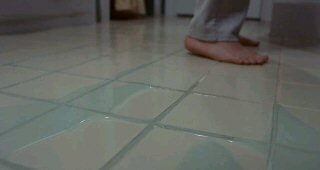 Comme il glisse sur la flaque qui le suit depuis qu'il